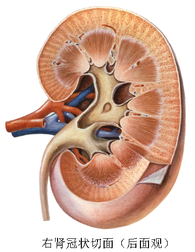肾的冠状切面观,肾实质可分为表层的肾皮质和深层的肾髓质两部分。