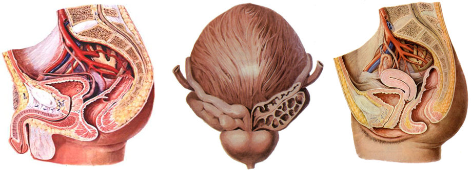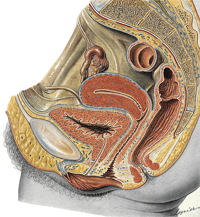 下方:男性邻前列腺,女性邻尿生殖膈。
