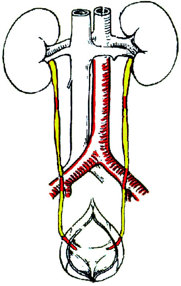 起自肾盂下端,经腰大肌前面,在小骨盆入口处,左侧跨过髂总动脉末端,右侧跨过髂外动脉起始部进入盆腔。