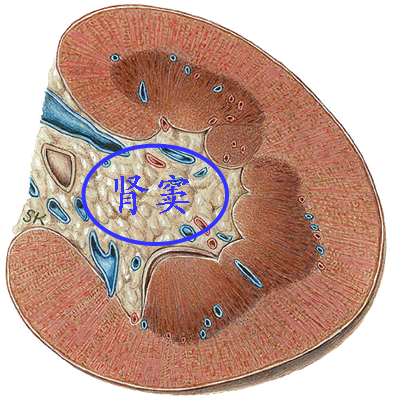 肾窦(renal sinus):肾门向肾实质内伸入,由肾实质围成的腔隙,内含肾血管,肾小盏、肾大盏、肾盂和脂肪组织等。