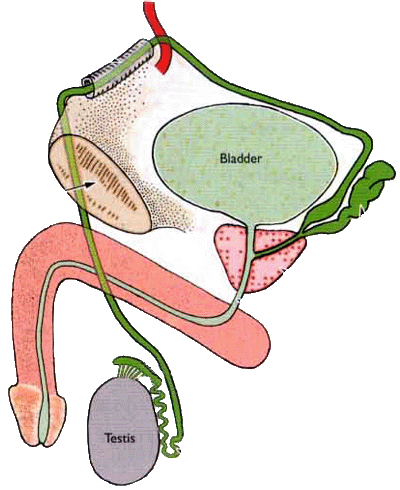 4.盆部:最长,位于盆腔内,沿盆侧壁向后下,经输尿管末端前方至膀胱底的后面,在此处膨大形成输精管壶腹。