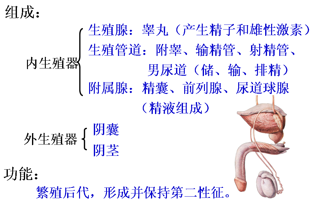 睾丸位于阴囊内,左、右各一,功能是产生精子和分泌雄性激素。