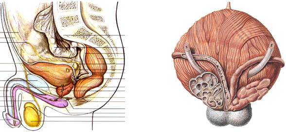 前列腺位于膀胱与尿生殖膈之间,底与膀胱颈、精囊和输精管壶腹相邻,前方为耻骨联合,后方为直肠壶腹。