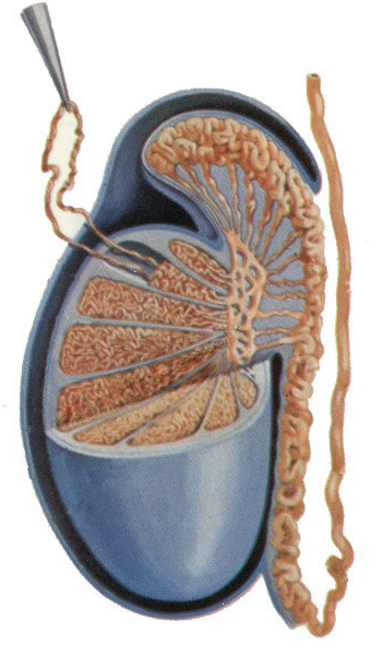 白膜 → 睾丸纵隔 → 睾丸小隔 → 睾丸小叶100~200,含2~4生精小管(产生精子)、间质细胞(分泌雄性激素)→ 精直小管 → 睾丸网 → 睾丸输出小管