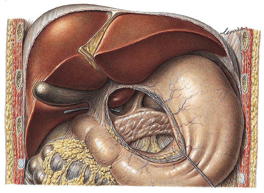 1.小网膜 lesser omentum 是从肝门向下移行至胃小弯和十二指肠上部的双层腹膜结构 其左侧部连于肝门和胃小弯之间,称肝胃韧带 ;小网膜的右侧连于肝门和十二指肠上部之间,称肝十二指肠韧带,其内有右前方的胆总管、左前方的肝固有动脉和两者后方的肝门静脉。