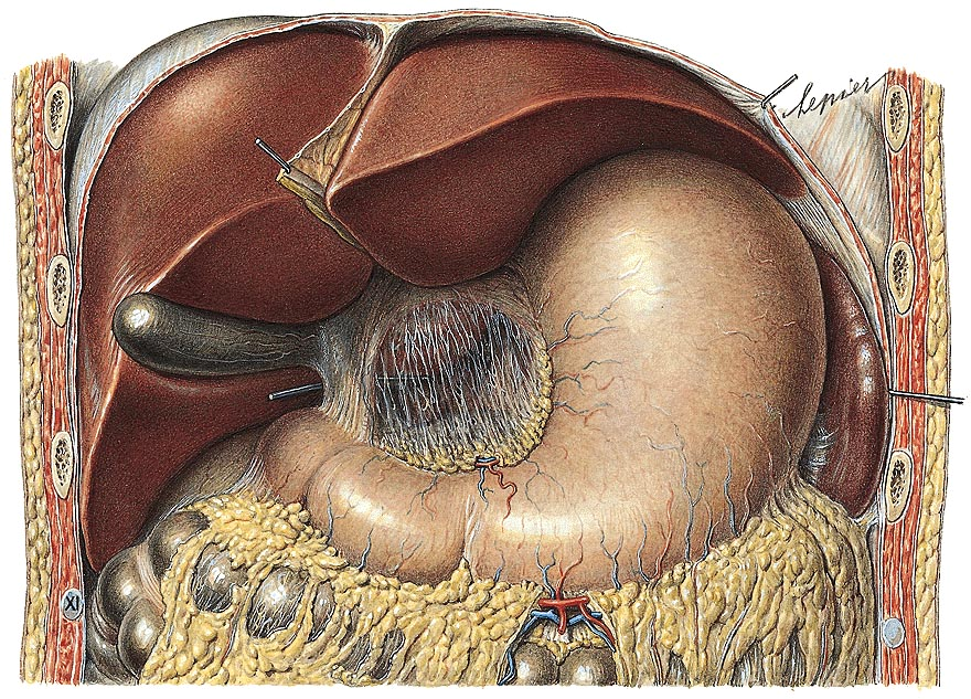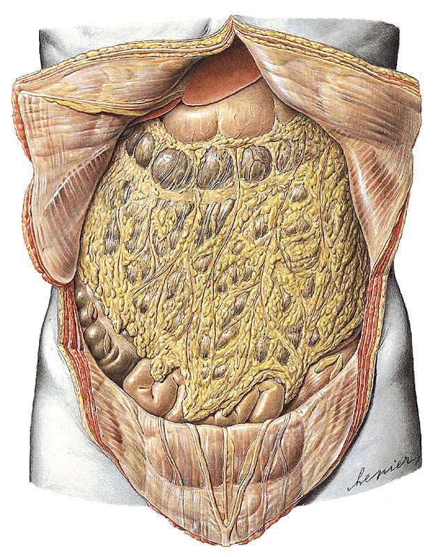 2.大网膜 greater omentum 是连于胃大弯和横结肠之间的双层腹膜结构,形似围裙覆盖于空、回肠和横结肠前方,其左缘与胃脾韧带相连续。大网膜由四层腹膜组成,连于胃大弯和横结肠之间的大网膜前两层则形成胃结肠韧带 gastrocolic ligament。