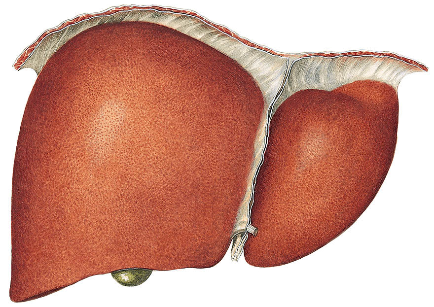 肝的上方有镰状韧带、冠状韧带,左、右三角韧带;下方有肝胃韧带和肝十二指肠韧带;前方有肝圆韧带。