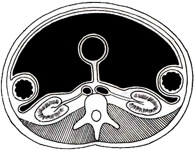 仅一面被腹膜覆盖的器官为腹膜外位器官,如肾、肾上腺、输尿管、空虚的膀胱、十二指肠降部、下部和升部、直肠中、下段及胰等。