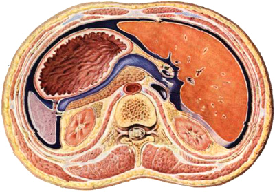 肝肾隐窝 hepatorenal recess:位于肝右叶与右肾之间,仰卧位是,是腹膜腔的最低部位。