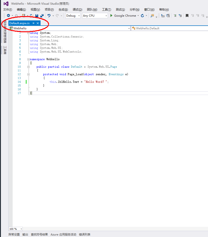 (3)切换到Default.aspx.cs页面,如图1-10所示。