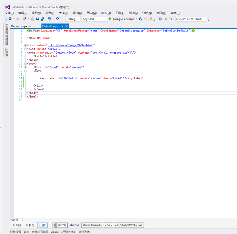 (2)打开Default.aspx页面并单击【源】按钮,如图1-9所示。