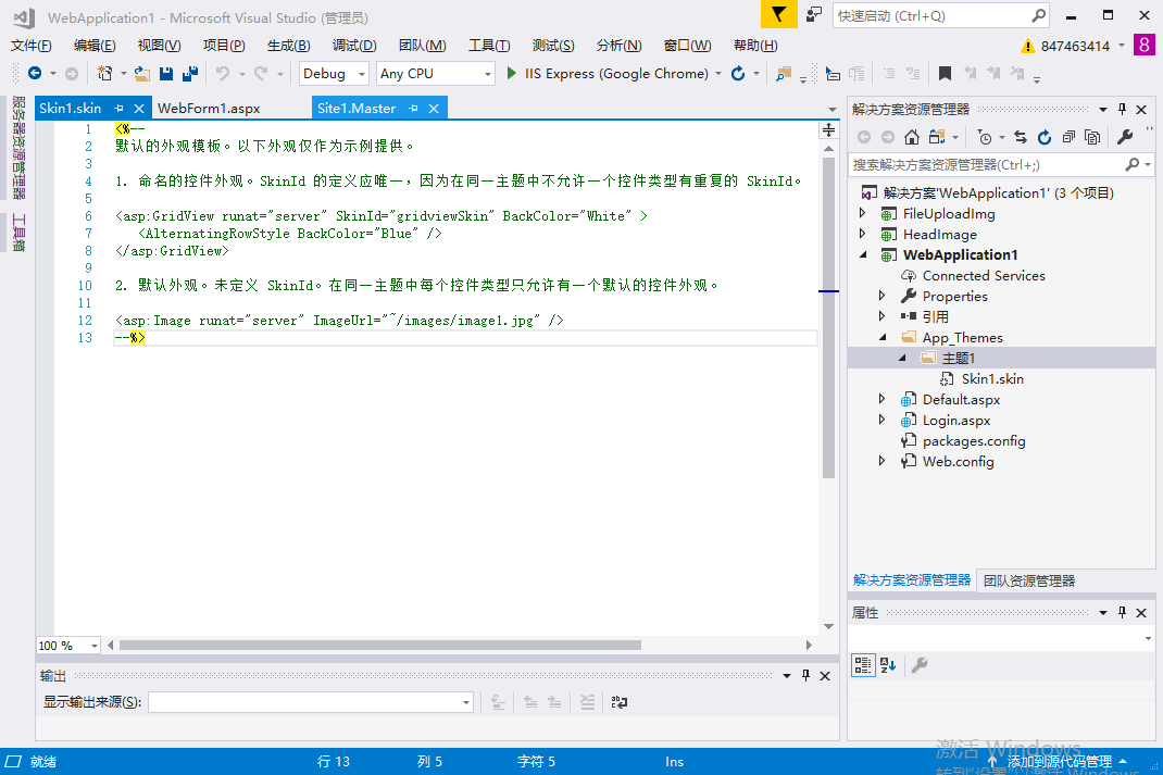 第二种方法是在CSS文件中使用图像,与直接在Skin文件中使用图像一样,将图像放在Images目录下,在Skin文件中设置ASP.NET服务器控件的CssClass属性。这里在StyleSheet1.css文件中添加控件的CSS代码。