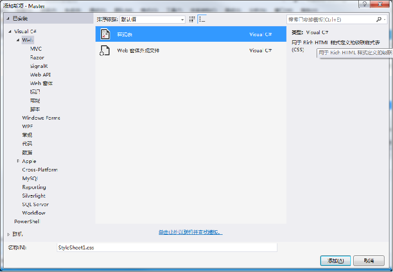 (5)在主题中使用CSS文件。除了在.skin文件中创建服务器控件定义之外,还可以使用CSS进行进一步的定义,使HTML服务器控件、HTML和原始文本都根据主题来改变。首先右击【主题1】,在弹出的快捷菜单中选择【添加】→【新建项】命令,在弹出的对话框中的【名称】文本框内输入样式表的名称,如图1-6所示。