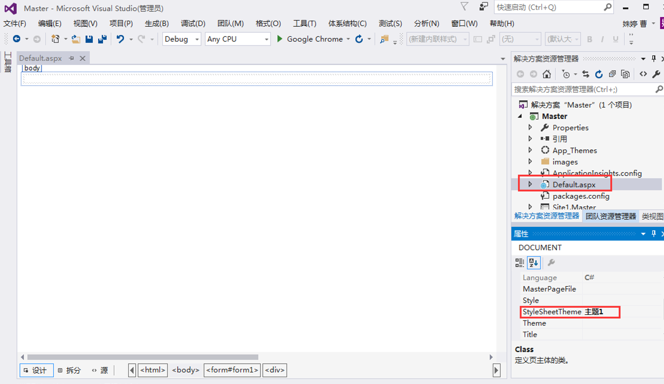 (4)使用主题。将Skin文件保存后,再新建一个Web窗体页面Default.aspx,此页面将应用之前设置的主题。首先选择页面的Document属性中的StyleSheetTheme选项,将此选项设置为“主题1”,如图1-5所示。