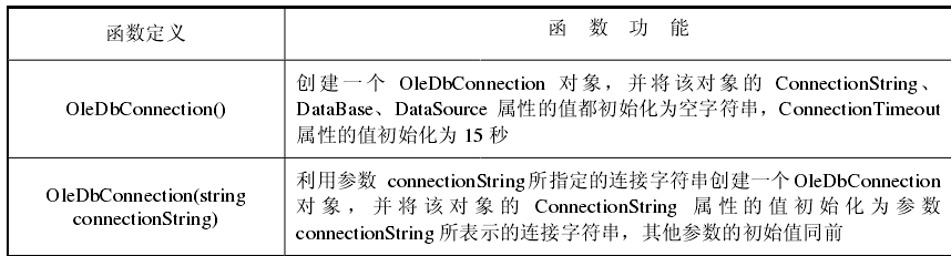 表1-7分别型列出了OLE DB数据提供者中类OleDbConnection的两个构造函数的原型及其功能。