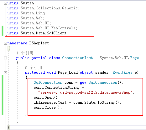 (2)在后台编码文件的顶部添加下列导入语句,因为此处将用到这些命名空间中的类:using System.Data.SqlClient;