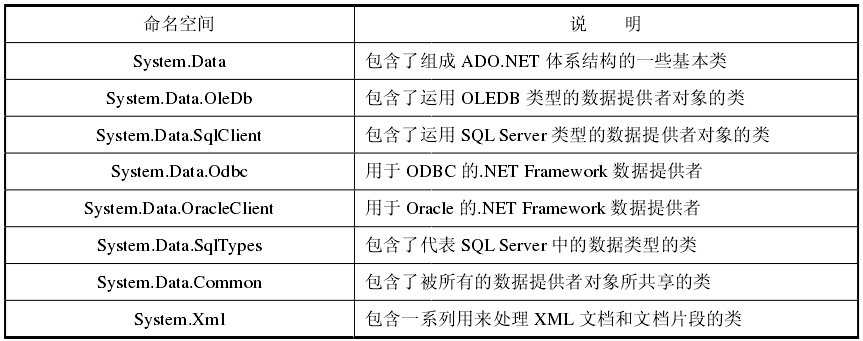 表1-5简要列举了.NET框架中与ADO.NET相关的几个命名空间。
