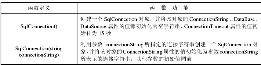 表1-6分别列出了SQL Server数据提供者中类SqlConnection的两个构造函数的原型及其功能。