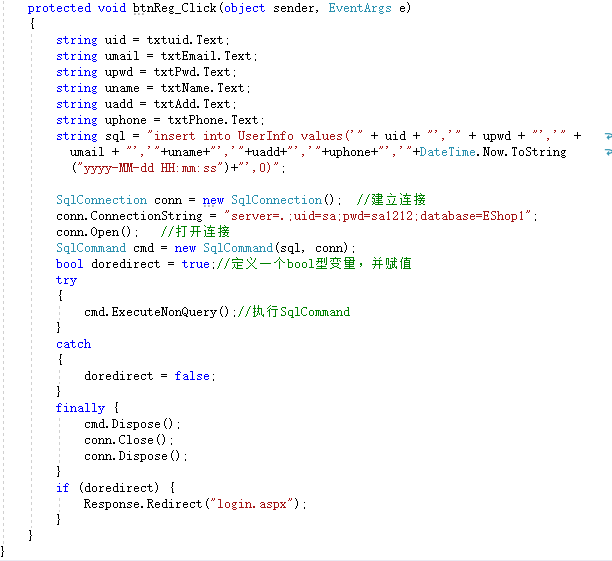 在代码块中,使用的是Command对象的ExecuteNonQuery()方法,因为Insert语句并不返回结果(可以选择查看受影响的行数,但是这里暂且把它忽略)。可根据命令的执行结果——成功或失败(由doredirect变量进行跟踪)——把用户定向到指定页面: