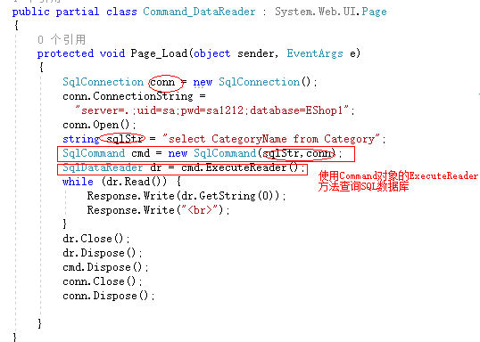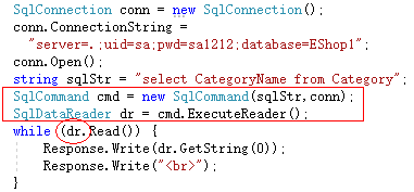 在代码中,SqlDataReader dr = cmd.ExecuteReader();语句表示定义一个SqlDataReader对象的实例,然后把Command对象执行的命令结果返回给对象变量dr。接着使用循环语句将查询到的数据输出显示到Web窗体上。最后释放资源关闭连接。