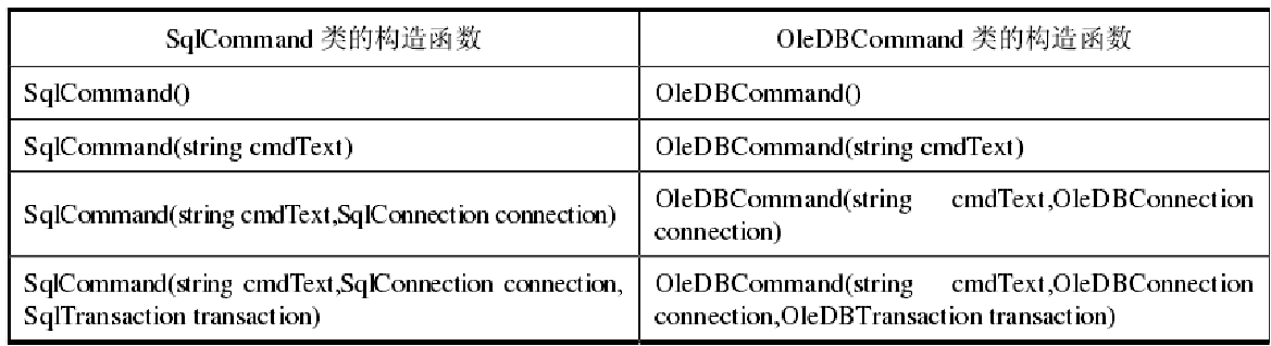3.Command对象的创建是由其对应的构造函数构造完成的,但是,不同的数据提供者用不同的类及其构造函数完成Command对象的构建,在SQL Server数据提供者中用类SqlCommand的构造函数创建Command对象,而在OLE DB数据提供者中用类 OleDBCommand的构造函数创建Command对象。表2-1列出这两个类的4种构造函数的原型。
