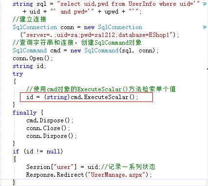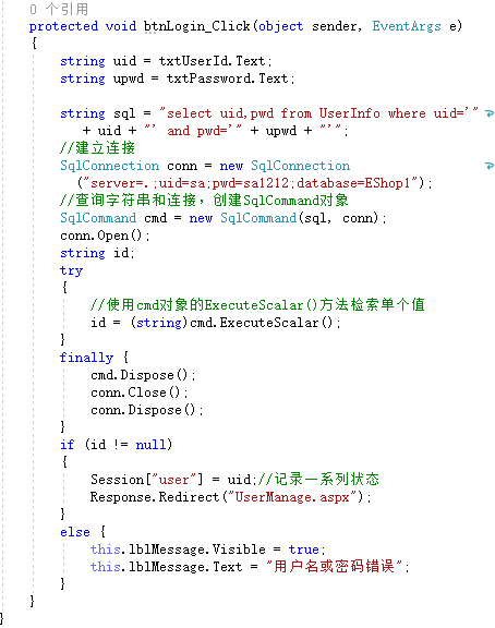 在该例中,将把刚才讨论的内容运用到代码中,在登录按钮的处理程序中,将使用ExecuteScalar()方法来检索给定登录名和密码的用户ID值。运行后的效果如图2-3所示。