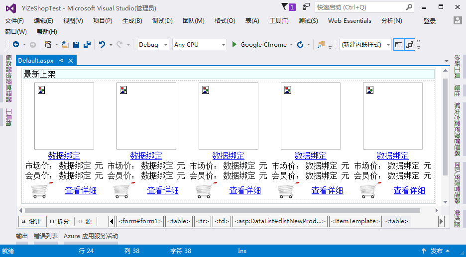 (8)下面来完成控件的属性设置及数据邦定:在ItemTemplate中的布局表格里添加控件。