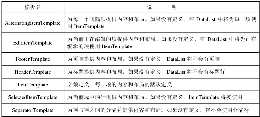 (2)在DataList控件中,ASP.NET也提供了7种模板列用来定义数据显示的内容和布局,具体参考下表。