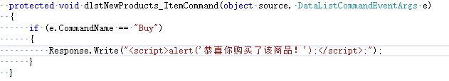 (11)添加dlstNewProducts的ItemCommand事件,在编辑模板的时候为购买商品按钮链接添加了命令名称为“Buy”。该事件就是根据这个命令执行对应的操作。