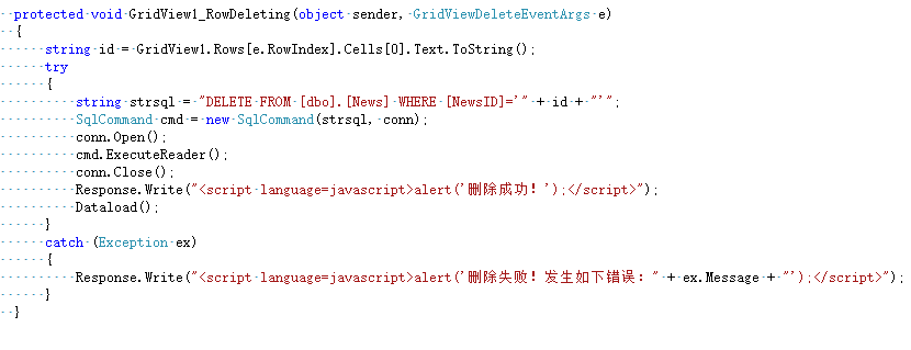 (9)添加GridView1的RowDeleting事件,并编写代码实现记录删除功能。