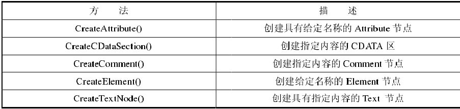 ②创建和添加节点。为了在文档中添加新的节点,必须首先用XMLDocument类的工厂方法来创建新的节点,然后将其添加到文档中。这些方法都以“Create”开始,并以创建的节点类型结尾。常用的Create方法见表1-1。