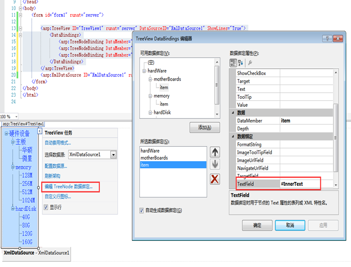 添加完数据绑定字段后,选中字段,此时将在右边显示数据绑定的属性,一般情况下只需要设置“TextField”属性和“ValueField”属性,在设置的时候,可以选择XML元素的属性或者元素的文本值。设置完成后,运行程序后TreeView控件将显示为如下图所示效果。