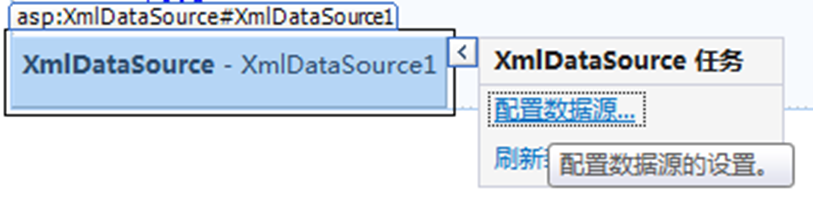 (2)创建XmlDataSource数据源。XmlDataSource提供了绑定XML文档的一种简单方式。首先在创建的窗体文件“Default.aspx”页面中添加XmlDataSource控件,用鼠标选择XmlDataSource控件后,选择【配置数据源】选项,如下图所示。