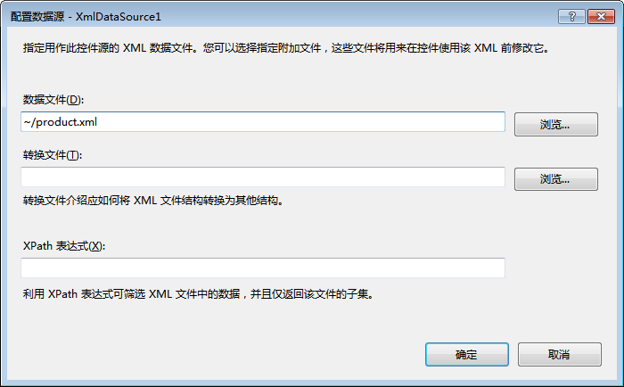 选择【配置数据源】选项后,弹出【配置数据源】对话框,在数据文件输入框内选择刚创建的XML数据文件“product.xml”,如下图所示,选择数据文件完成后,单击【确定】按钮完成XmlDataSource数据源的配置。