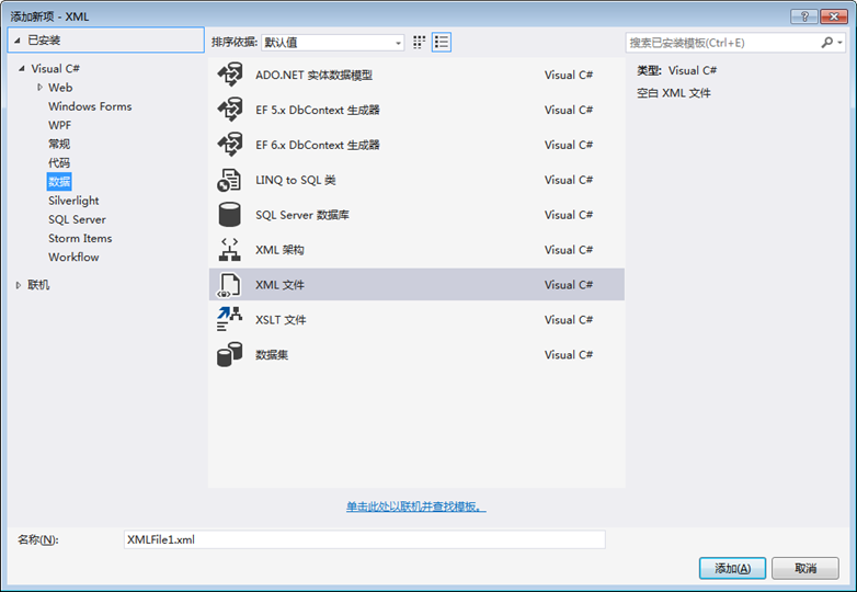 (1)创建XML数据文件。首先右击网站,从弹出的快捷菜单中选择【添加新项】命令,在弹出的对话框中选择【XML文件】选项,如下图所示。在【名称】文本框内输入XML数据文件名称“product.xml”。
