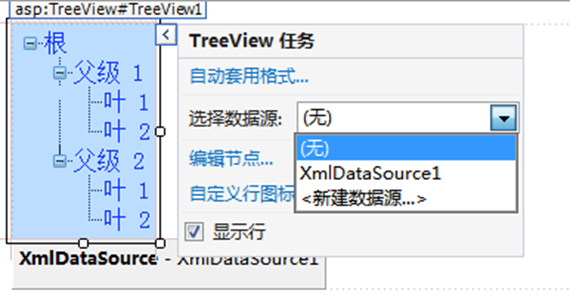 (3)TreeView控件绑定XmlDataSource数据源。在默认页面上,添加一个TreeView控件,用鼠标选中此控件,单击右上角的黑色箭头按钮,在弹出的对话框中,在【选择数据源】的下拉列表框中选择创建的XmlDataSource的名称“XmlDataSource1”,如下图所示。