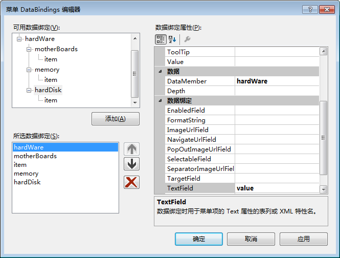 (4)使用数据源。Menu控件与TreeView控件一样,也可以绑定到其他数据源控件上。例如,在前面TreeView中使用的“product.xml”文件,通过创建XmlDataSource数据源进行绑定,通过菜单DataBindings编辑器进行编辑,如图1-8所示。