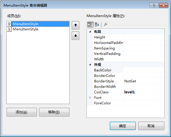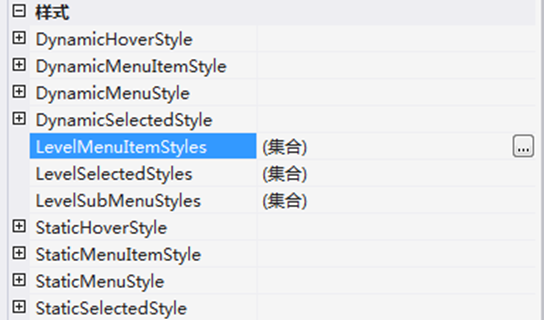 ②创建LevelMenuItemStyles。在样式文件中主要定义了三个样式,分别定义了第一层菜单项、第二层菜单项和鼠标在菜单项上悬浮时的样式。定义完样式后,修改Menu控件的“LevelMenuItemStyles”属性,如图1-5所示。