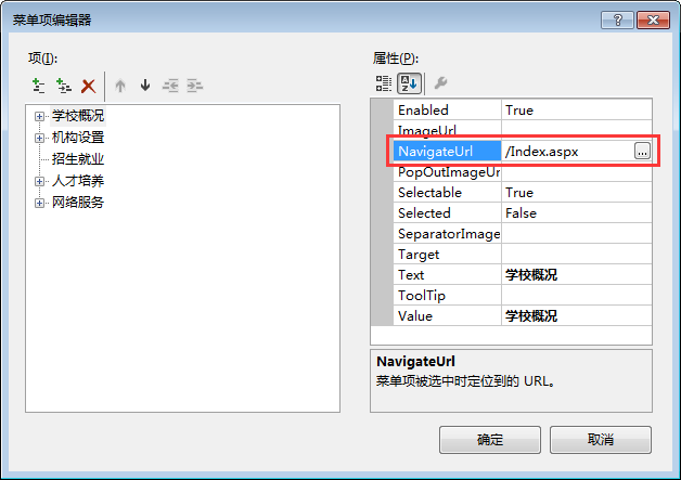 ③设置链接。在菜单项编辑器中,选择菜单项,在右边的属性栏中,直接设置“NavigateUrl”属性为相应的页面即可,如图1-7所示。