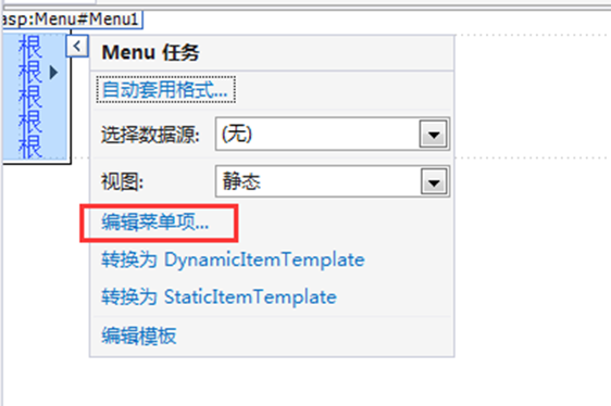 (1)创建菜单项。在页面中添加一个Menu控件,通过右上角智能标记菜单中选择【编辑菜单项】选项,如图1-2所示。选择此菜单项后,弹出【菜单项编辑器】对话框,如图1-3所示。