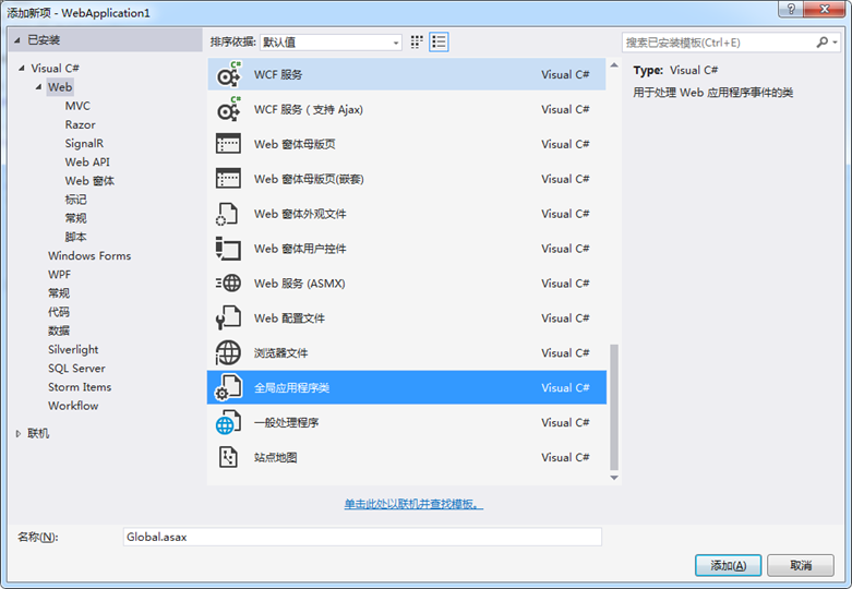 (2)Global.asax是一个用来处理应用程序全局的事件。打开文件,系统已经定义了一些事件的处理方法。详见课本。