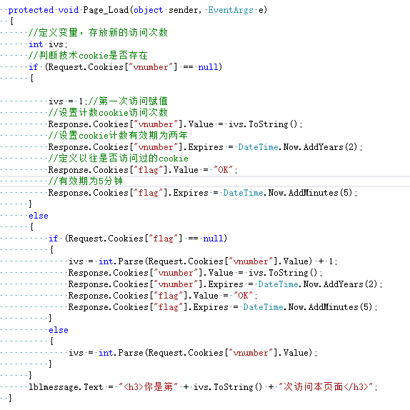 ③打开cookie.aspx.cs的代码编辑窗口,为Page_Load()添加代码。