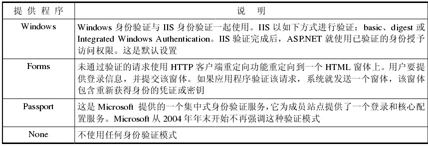 <authentication>节点用mode属性设置要使用的身份验证模式。其选项包括Windows、Forms、Passport和None。表2-1解释了这些选项。