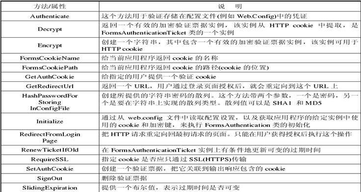 FormsAuthentication类有许多方法和属性,可以读取和控制验证Cookie以及其他信息(例如请求的返回URL)。下表列出了FormsAuthentication类的一些方法和属性: