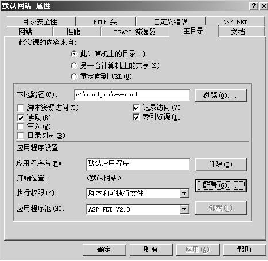 (1)在IIS管理器中右击【默认网站】节点,在弹出的快捷菜单中选择【属性】命令,在弹出的对话框中打开【主目录】选项卡。如图4-4所示。