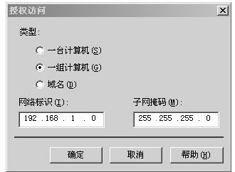(3)在对话框中选中【拒绝访问】单选按钮,然后单击【添加】按钮,弹出【授权访问】对话框,在对话框的【网络标识】和【子网掩码】文本框中输入要限制的IP地址和子网掩码,如图4-3所示。