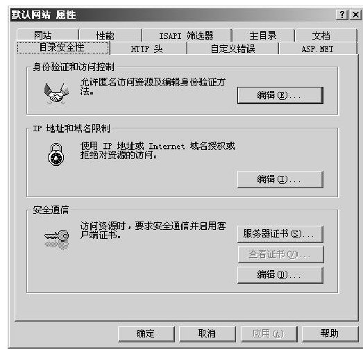 (1)可打开IIS管理器,右击【默认网站】节点,从弹出的快捷菜单中选择【属性】命令,在弹出的对话框中打开【目录安全性】选项卡,如图4-1所示。