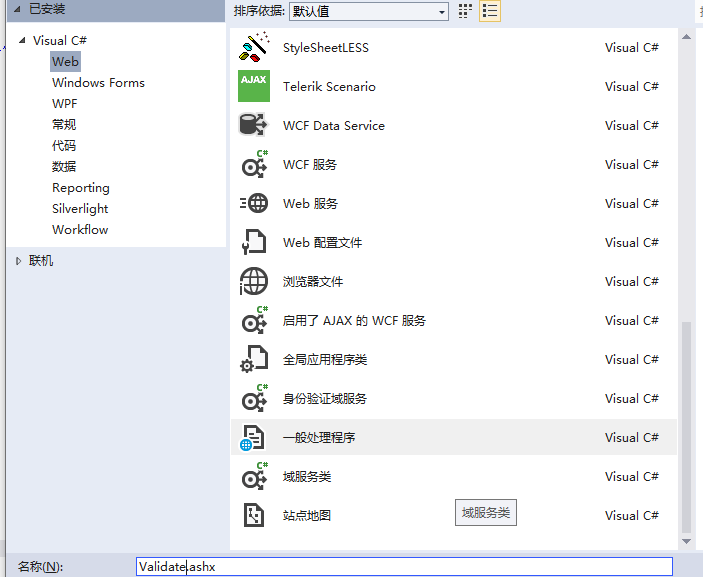 (1)创建HttpHandle处理程序。首先,启动VS,创建一个ASP.NET网站,选择【项目】→【添加新项】命令,在弹出的对话框中选择【一般处理程序】选项,如下图所示。
