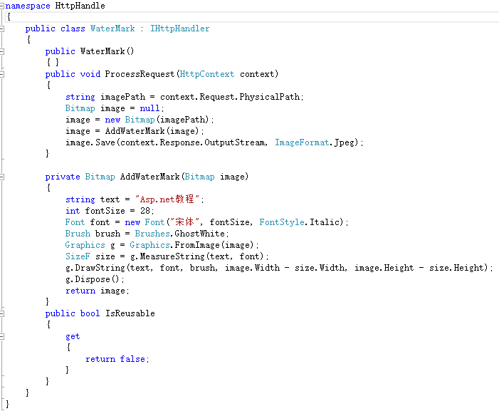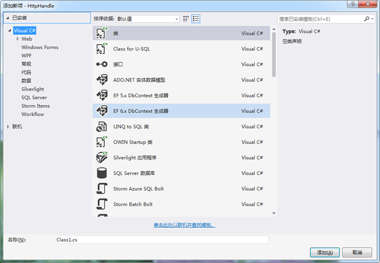 单击【添加】按钮,在生成的类中,修改类代码,让其实现IHttpHandler接口。