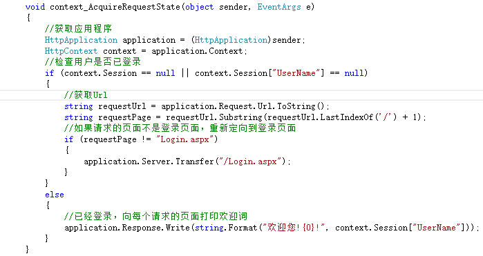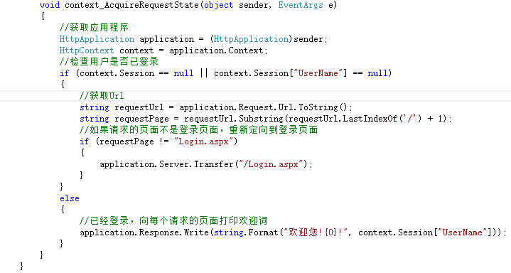 使用HttpModule实现对整个站点的访问控制,也就是用户必须通过登录页面进入系统,防止用户直接输入URL地址访问系统页面。准备两个或两个以上的页面,在没有获得授权之前,在地址栏输入其他任何页面地址都会跳转到登录页面,省去了在ASP中每个页面都需要判断会话的麻烦。具体运行效果如下图所示。